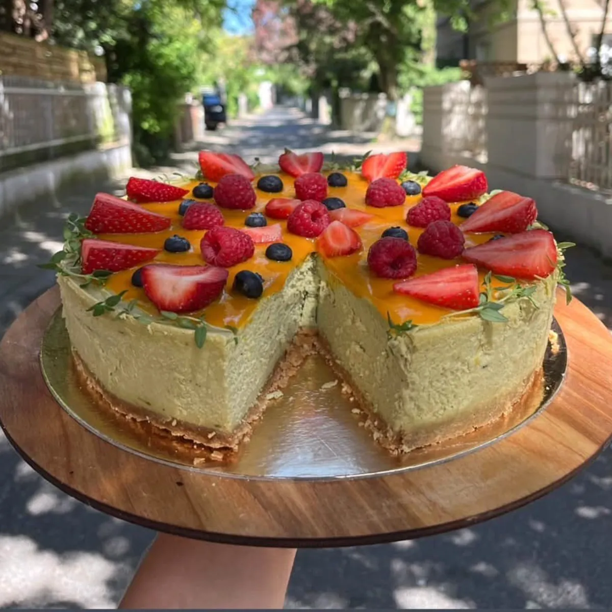 Kruchy spód bezglutenowy. Sernik na bazie twarogu, śmietanki, białej czekolady i matchy.